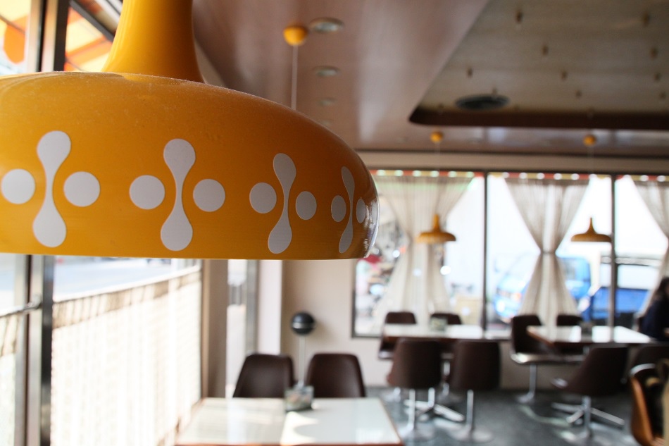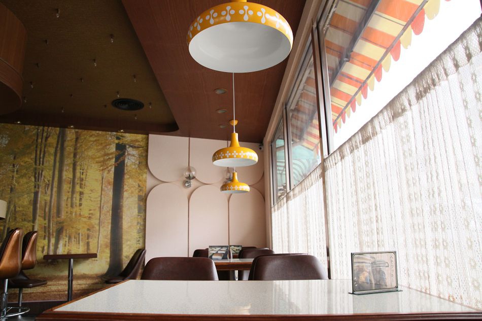 店裡坐椅是以四人座為主、裏頭黃色的吊燈顯眼非常,窗簾的選擇也相當到位,非常適合三五好友前來喫茶聊天的好所在