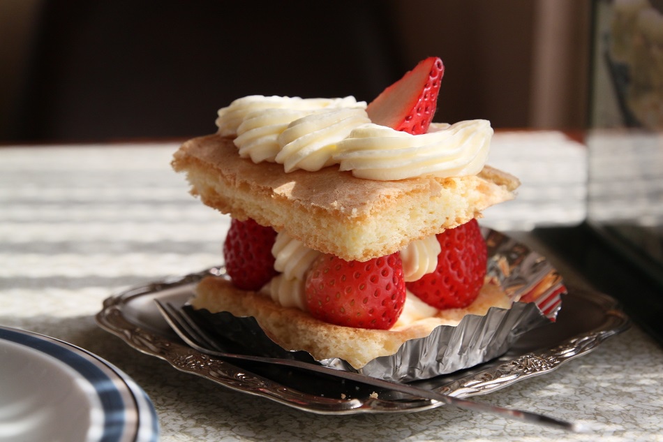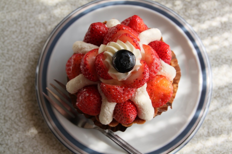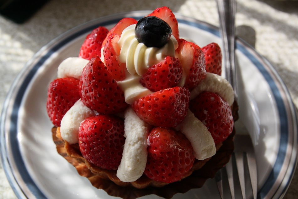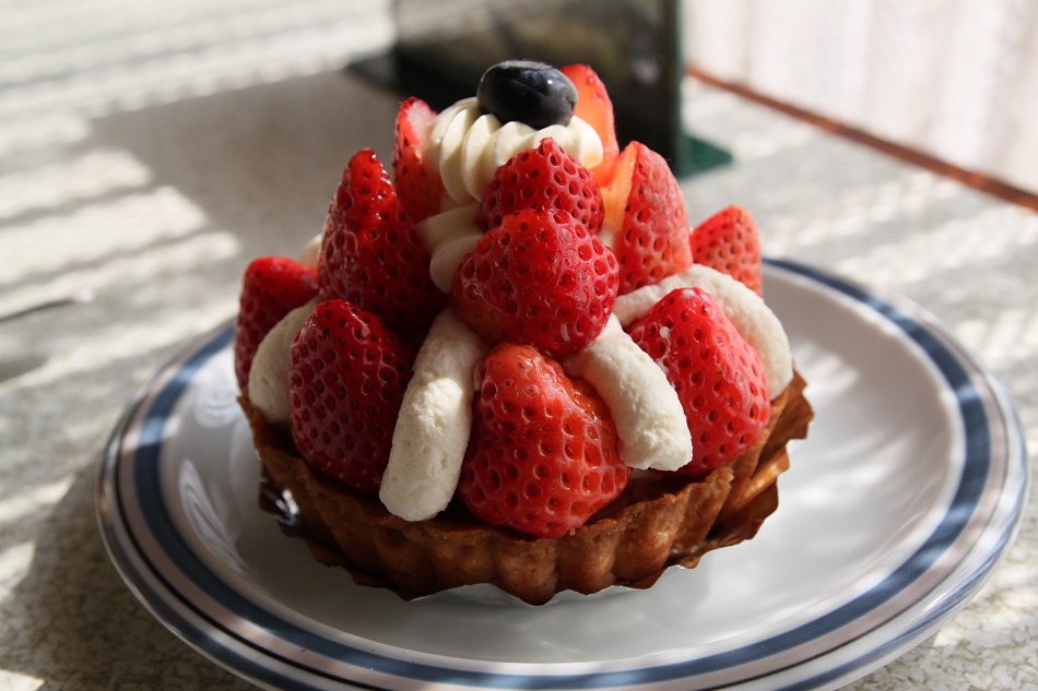 新鮮的草莓切片撲滿整個上層塔皮,正著時的草苺吃起來口感酸中帶甜,配上法式鮮奶油滑順又綿密,塔皮則是較為酥脆札實的口感,對於甜點不太擅長的我依舊發揮吃鹹食的霸氣KO它