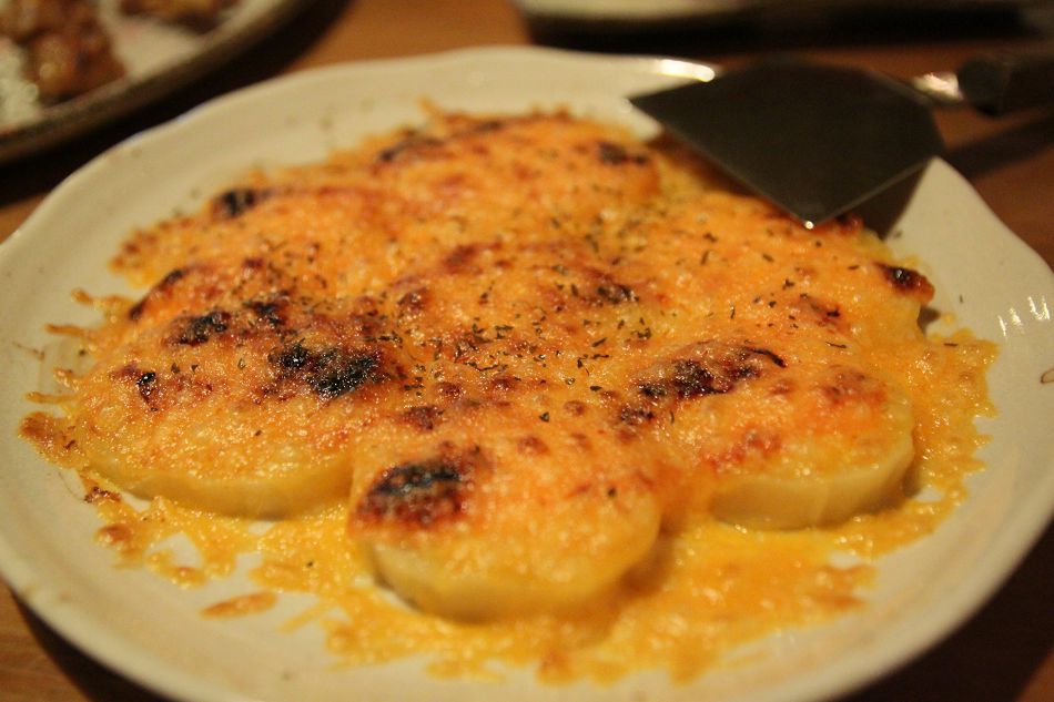 店家會附上小鍋鏟,方便切小塊跟同桌食客享用,馬鈴薯味道香甜配上美乃滋,外觀煎的酥脆內層則帶鬆軟綿密的口感,趁著一上桌碳燒吃更是加倍美味