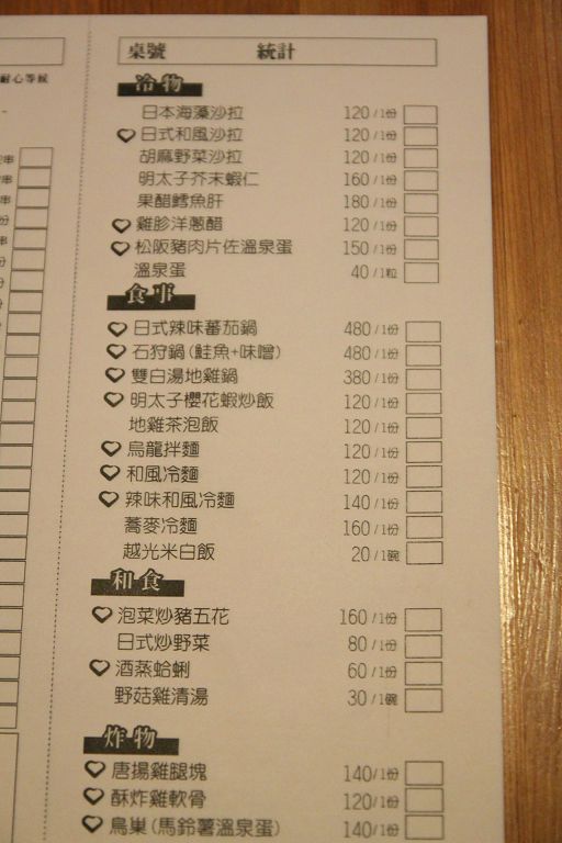 日式和風沙拉$120、酒蒸蛤仔湯$60、烏龍拌麵$120、明太子櫻花蝦炒飯$120、鹽烤雞肉串$80、起司雞肉丸$100、馬鈴薯佐美乃滋$90、雞膝軟骨$40x2、炭烤鹹豬肉$160、唐揚炸雞塊$140、清酒$120